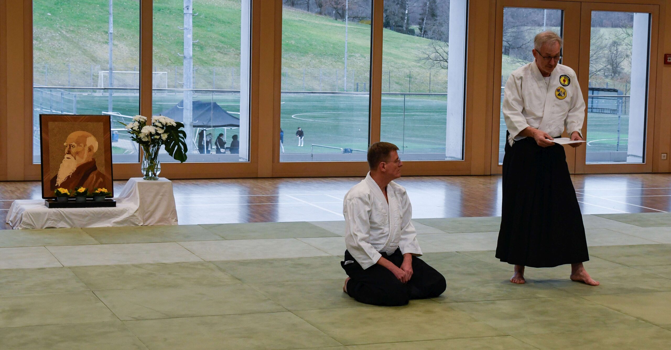 Nach Abschluss des Trainings und einer kurzen Pause war dann Elmar aus dem Stuttgarter Dojo an der Reihe. Die Prüfung auf den ersten Dan stand an. Wie üblich beginnt eine Prüfung mit der Überprüfung des seither gelernten. Also alle Techniken von gelb bis braun. Erst wen sich alle 3 Prüfer einig sind, dass die Überprüfung bestanden wurde, geht es zur eigentlichen Prüfung mit den neuen Techniken auf den ersten Schwarz-Gurt. Diese beginnt mit der Vorführung der ersten Kata, gefolgt von den Dan Techniken und zum Abschluss ein Randori, wobei der Angreifer mit allen drei Schlagangriffen durcheinander angreift. Nach kurzer Beratungsphase durch die Prüfer stand das Ergebnis fest – Bestanden. Wir gratulieren Elmar vom Aikido Dojo Stuttgart ganz herzlich zur erfolgreichen Prüfung zum 1. Dan.