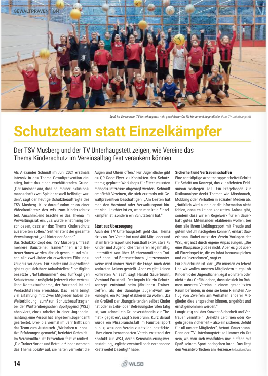 Im Verbandsmagazin SPORT in BW vom WLSB erschien dieses Mal ein Bericht über Vereine mit Kinderschutz. Für diesen Bericht wurde unser Schutzteam interviewt und der Bericht hier veröffentlicht.